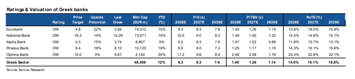 Η χρηματιστηριακή δίνει σύσταση overweight για όλες τις τράπεζες αντανακλώντας την εκτίμηση ότι ο κλάδος συνεχίζει να διαπραγματεύεται με ελκυστικούς όρους σε σχέση με τις προοπτικές του, παρά την ισχυρή άνοδο 12% από τις αρχές του έτους. Αξίζει να σημειωθεί ότι οι ελληνικές τράπεζες υπεραποδίδουν έναντι των ευρωπαϊκών, με τον δείκτη SX7P να καταγράφει κέρδη μόλις 4,2% στο ίδιο διάστημα.