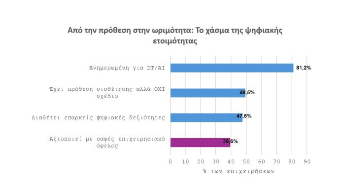 Ενδεικτικά, μόλις το 39,6% των επιχειρήσεων δηλώνει ότι μπορεί να προσδιορίσει με σαφήνεια το επιχειρησιακό όφελος από την αξιοποίηση των ψηφιακών τεχνολογιών.