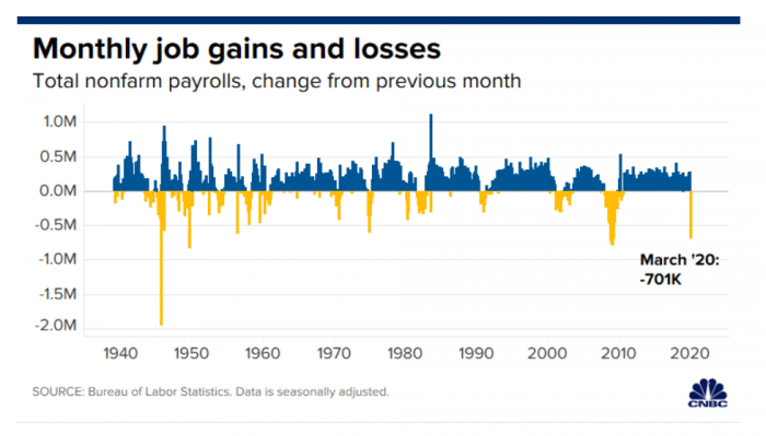 Αξίζει να σημειωθεί, επίσης, ότι οι αναλυτές περίμεναν ότι θα υπάρξει μείωση μόλις 10.000 θέσεων εργασίας, με την ανεργία να αυξάνεται οριακά στο 3,7% από 3,5% που ήταν τον προηγούμενο μήνα, αλλά και αυτές οι προβλέψεις ήταν πριν κλιμακωθεί η κρίση στη χώρα λόγω της εξάπλωσης της πανδημίας του κορονοϊού.