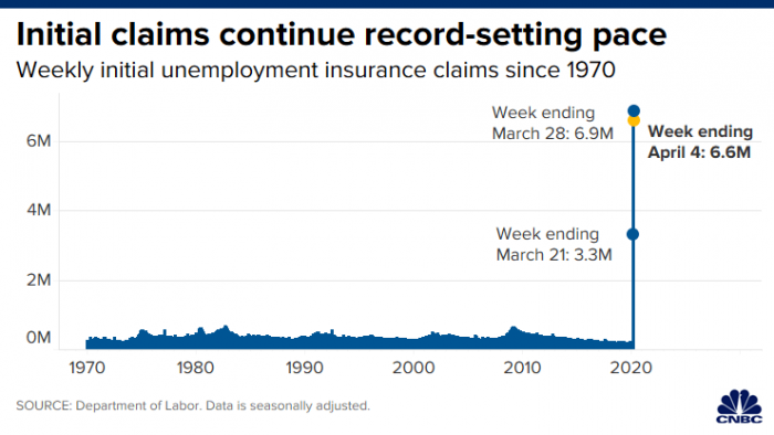 Όπως ανακοίνωσε η αρμόδια υπηρεσία του αμερικανικού υπ. Εργασίας, για την εβδομάδα που ολοκληρώθηκε στις 4 Απριλίου αίτηση για να λάβουν επίδομα ανεργίας κατέθεσαν 6,6 εκατ. Αμερικανοί, δηλαδή αρκούντως περισσότεροι από τα πέντε εκατ. που ανέμεναν οι αναλυτές. Παράλληλα το υπουργείο προχώρησε και σε αναθεώρηση των στοιχείων για την προ-προηγούμενη εβδομάδα, με τα συνολικά επιδόματα να φθάνουν στα 6,9 εκατ. έναντι 6,3 εκατ. που είχε αρχικά ανακοινωθεί.