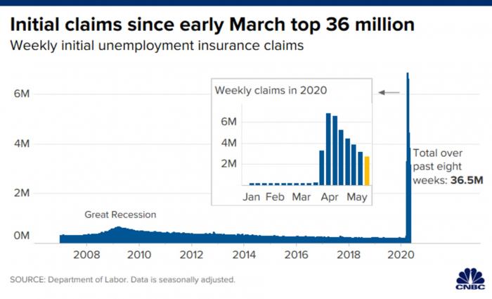 Αποτέλεσμα ο συνολικός αριθμός των Αμερικανών που βρέθηκαν εκτός αγοράς εργασίας από τον Μάρτιο έως και πριν από μία εβδομάδα να φθάνει στα 36,5 εκατ., επίπεδο πρωτόγνωρο για τις ΗΠΑ, ενώ σύμφωνα με πρόσφατη ανακοίνωση του αμερικανικού υπ. Εργασίας κατά τη διάρκεια του Απριλίου χάθηκαν 20,5 εκατ. θέσεις εργασίας και η ανεργία σκαρφάλωσε στο 14,7%, δηλαδή στο υψηλότερο επίπεδο από το τέλος του Β' Παγκοσμίου Πολέμου έως και σήμερα.