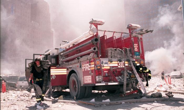 Φθάνοντας στο ισόγειο έπειτα από περίπου 50 λεπτά, το έδαφος είνι γεμάτο λυγισμένο ατσάλι, τσιμέντο και κηλίδες αίματος. «Ξέραμε από τι ήταν», λέει. Οι εικόνες ανθρώπων παγιδευμένων στις φλόγες που πέφτουν στο κενό θα είναι από τις πιο εφιαλτικές εκείνης της ημέρας.