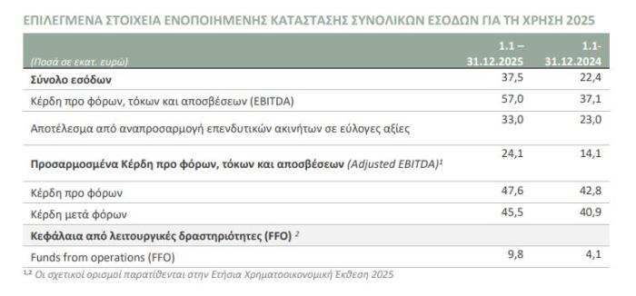 Τα κέρδη προ φόρων ανήλθαν σε 47,6 εκατ. ευρώ (από 42,8 εκατ.), ενώ τα καθαρά κέρδη μετά φόρων διαμορφώθηκαν σε 45,5 εκατ. ευρώ, αυξημένα κατά 11% σε ετήσια βάση. Τα κεφάλαια από λειτουργικές δραστηριότητες (FFO) υπερδιπλασιάστηκαν, φθάνοντας τα 9,8 εκατ. ευρώ από 4,1 εκατ. ευρώ το 2024, στοιχείο που ενισχύει τη δυνατότητα διανομών και περαιτέρω επενδύσεων.