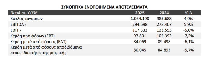 Παράλληλα, τα Ίδια Κεφάλαια του Ομίλου στις 31/12/2025 διαμορφώθηκαν στα €584 εκατ., σημαντικά αυξημένα από τα αντίστοιχα €490 εκατ. στις 31/12/2024.