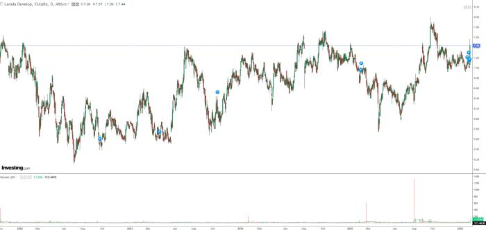 Lamda Develpment: Μετά από καιρό έκανε πάλι μία δυνατή κίνηση. Συνήθως φεύγει από τα 6,7-7 ευρώ πάει μέχρι τα 7,6-8 ευρώ και ξαναγυρίζει πίσω. Μοτίβο που έχει απογοητεύσει πολλούς.
