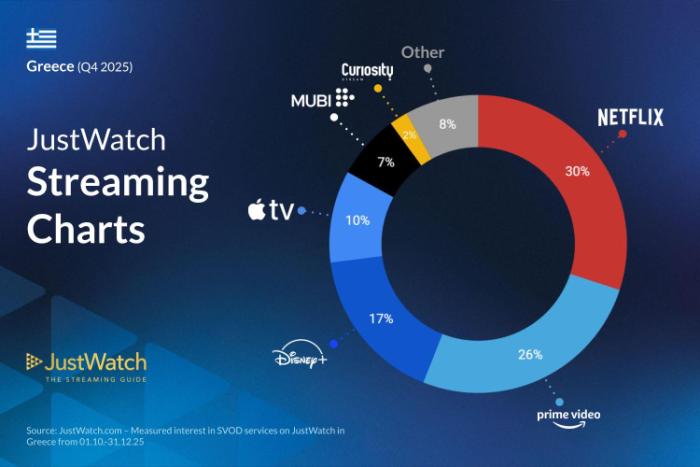 Σύμφωνα με τα στοιχεία του Just Watch, στο τελευταίο τρίμηνο του 2025, Netflix και Amazon Prime Video διατήρησαν τις δύο πρώτες θέσεις αντίστοιχα στην ελληνική αγορά streaming, με το Disney+ να ακολουθεί, και τα ποσοστά τους να δείχνουν «βαλτωμένα».