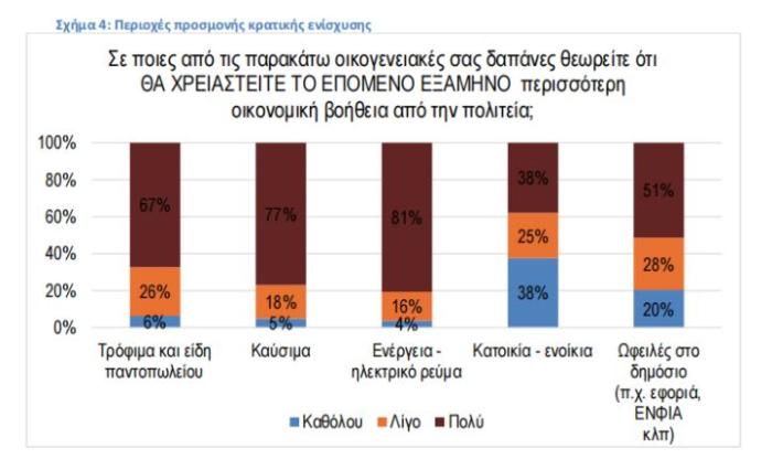 Τέλος, στο σχήμα 4 καταγράφεται έναν καταναλωτικό κοινό με έντονη προσμονή για κρατική ενίσχυση, με τα δεδομένα αναδεικνύουν ότι η ενεργειακή επιβάρυνση εξακολουθεί να αποτελεί το σημαντικότερο πεδίο ανάγκης παρέμβασης. Συγκεκριμένα. σε ό,τι αφορά τις ανάγκες οικονομικής ενίσχυσης για το επόμενο εξάμηνο: