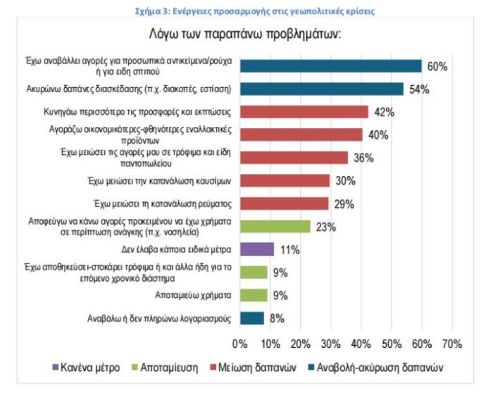 Όπως καταγράφεται στο σχήμα 3, οι καταναλωτές προχωρούν σε άμεσες προσαρμογές της καθημερινής τους συμπεριφοράς με κύριες κατευθύνσεις την αναβολή δαπανών και την μείωση δαπανών. Συγκεκριμένα για την αναβολή δαπανών: