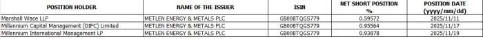 Συνεχίζονται οι μάχες επί της μετοχής της Metlen, με το Millennium International Management να αυξάνει καθημερινά τη shortτου θέση και να έχει φτάσει στο 0,93878%, ενώ το Millennium Capital Management έχει θέσει short0,95564% επί του συνόλου των μετοχών.