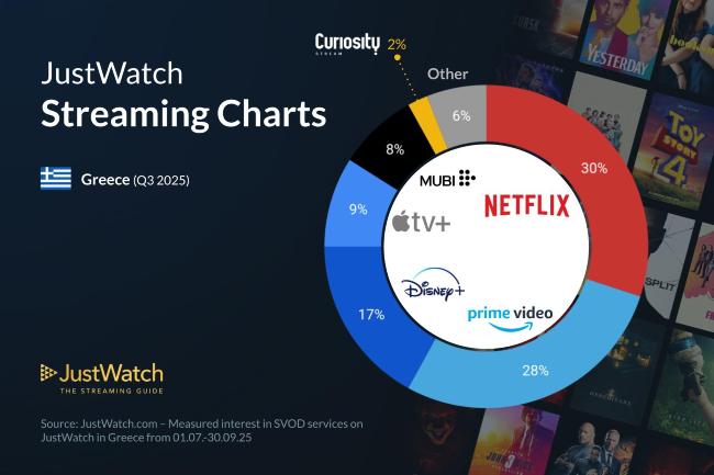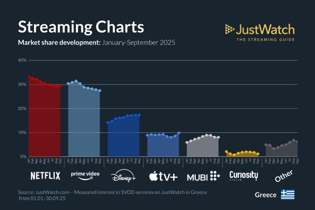 Σύμφωνα με τα στοιχεία του Just Watch, στο τρίτο τρίμηνο του 2025, Netflix και Amazon Prime Video διατήρησαν τις δύο πρώτες θέσεις αντίστοιχα στην ελληνική αγορά streaming, με το Disney+ να ακολουθεί. Πιο πίσω βρίσκεται η Apple TV και η Mubi, ενώ σταθερά παραμένουν και τα ποσοστά της πλατφόρμας Curiosity.