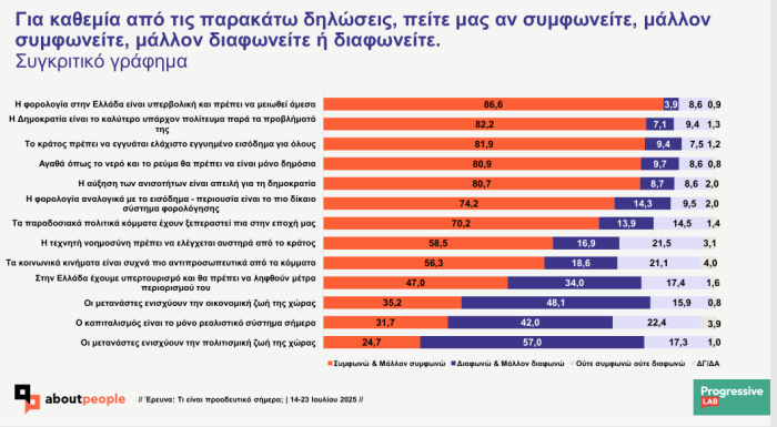 Το 86,6% του γενικού κοινού συμφωνεί ή μάλλον συμφωνεί ότι η φορολογία στην Ελλάδα είναι υπερβολική και πρέπει να μειωθεί άμεσα, ενώ στους μάλλον προοδευτικούς το ποσοστό αυτό είναι 84,6%. Το 82,2% του συνόλου θεωρεί τη Δημοκρατία το καλύτερο πολίτευμα παρά τα προβλήματά της, με το 88% των μάλλον προοδευτικών να συμφωνεί με αυτή τη θέση.