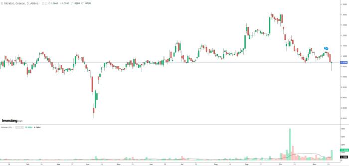 Η εσωτερική αξία της μετοχής είναι στα 2,65 ευρώ με την τιμή στο ταμπλό στα 1,7950 ευρώ. Οι επενδυτές θα λάβουν προσωρινό μέρισμα 0,065 ευρώ (αποκοπή 30 Δεκεμβρίου). Να σημειωθεί πως η μόχλευση είναι σε καλά επίπεδα (43,66%). Χθες ήταν από τις λίγες που κατάφεραν να έχουν θετικό πρόσημο.