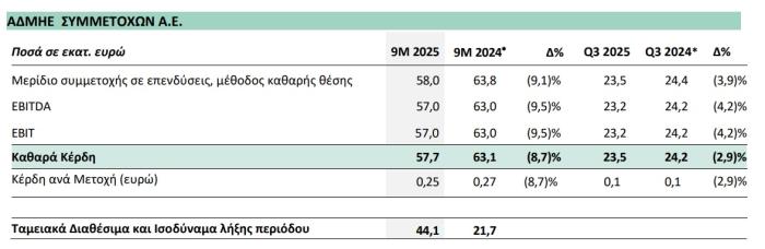 Στο εννεάμηνο τα καθαρά κέρδη ήταν στα 57,7 εκατ. ευρώ μειωμένα κατά 8,7%. Παρά τις δύο διανομές μερισμάτων τα ταμειακά διαθέσιμα ανήλθαν στα 44,1 εκατ. ευρώ. Η ΑΔΜΗΕ Α.Ε. είχε επενδυτικές δαπάνες στο εννεάμηνο 452 εκατ. ευρώ. Μετά την πτώση της μετοχής η αποτίμηση μάλλον είναι ελκυστική.