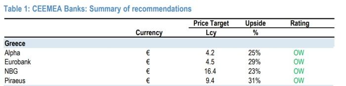 Οι αναλυτές της JP Morgan δίνουν τιμή στόχο για την Εθνική τα 16,4 ευρώ, για την Alpha Bank τα 4,2 ευρώ, για την Πειραιώς τα 9,4 ευρώ και για τη Eurobank τα 4,5 ευρώ.