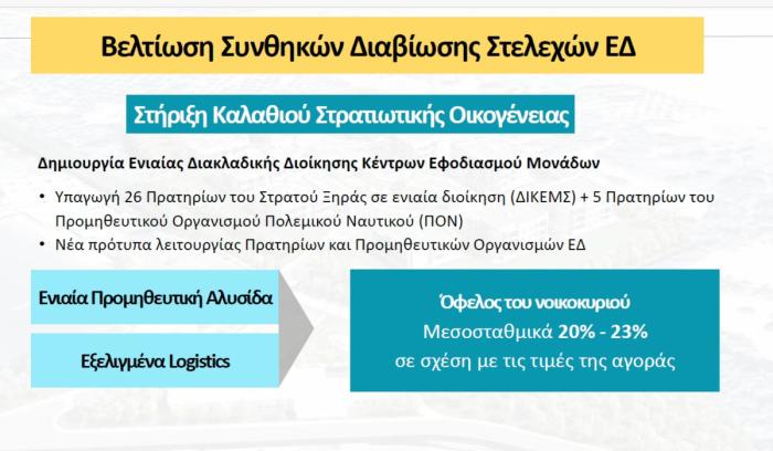 Το υπουργείο Εθνικής Άμυνας ανακοίνωσε την στήριξη του «καλαθιού στρατιωτικής οικογένειας» καθώς θα δημιουργηθεί μία ενιαία διακλαδική διοίκηση κέντρων εφοδιασμού μονάδων (ΔΙΚΕΜΣ) και θα υπαχθούν σε αυτήν τα 26 πρατήρια του στρατού ξηράς και τα 5 πρατήρια του Προμηθευτικού Οργανισμού Πολεμικού Ναυτικού. Επίσης θα υπάρχουν νέα πρότυπα λειτουργίας πρατηρίων και προμηθευτικών οργανισμών με ενιαία προμηθευτική αλυσίδα. Το αποτέλεσμα θα είναι όφελος του νοικοκυριού των στρατιωτικών μεσοσταθμικά 20 – 23% σε σχέση με τις τιμές της αγοράς