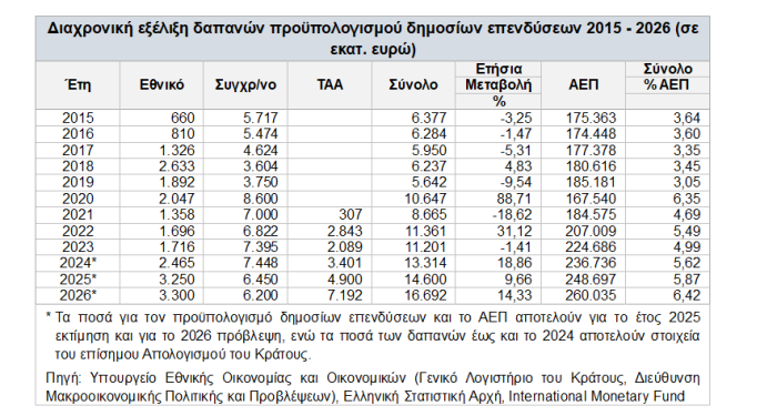 Όπως αναφέρει το σχέδιο του Προϋπολογισμού, οι αυξημένοι πόροι και η περαιτέρω ωρίμανση των έργων που χρηματοδοτούνται από το ΤΑΑ, αναμένεται να επιφέρουν ενίσχυση της επενδυτικής δραστηριότητας, με τον ρυθμό μεταβολής να αναμένεται να αυξηθεί από 4,5% το 2024 σε 5,7% το 2025 και σε 10,2% το 2026.