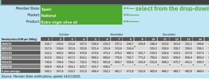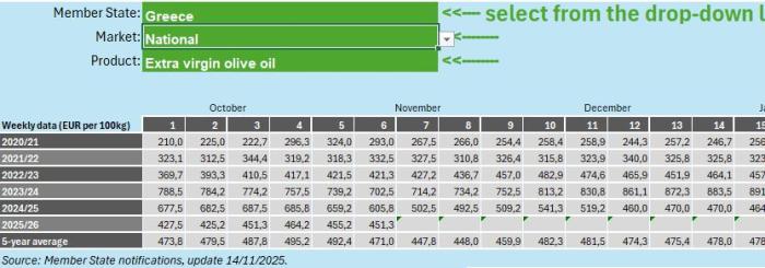 Σύμφωνα και με τα στοιχεία της Ευρωπαϊκής Ένωσης η εικόνα δεν διαφοροποιείται ουσιαστικά σε σχέση με τα επίπεδα πριν την επίσημη έναρξη της νέας ελαιοκομικής περιόδου, την 1η Οκτωβρίου 2025, με τις μέσες τιμές παραγωγού να κυμαίνονται στα 427,5 ευρώ τα 100 κιλά την πρώτη εβδομάδα του Οκτωβρίου και στα 425,16 ευρώ τη δεύτερη.