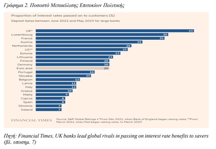 Ωστόσο αν δει κανείς τον πίνακα με το ποσοστό μετακύλισης των επιτοκίων που δημοσιεύεται στην έρευνα το ποσοστό της Ελλάδας είναι στο 10%. Αλλά αντίστοιχα είναι τα ποσοστά σε όλες τις χώρες του Νότου. Η Ιταλία είναι στο 11%, η Κύπρος στο 8%, η Ισπανία στο 8% επίσης.