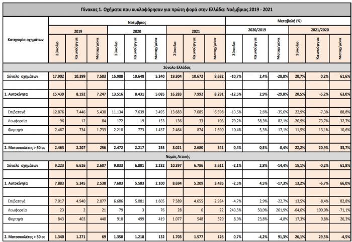 Το 11μηνο εφέτος, κυκλοφόρησαν για πρώτη φορά 186.545 αυτοκίνητα (καινούργια ή μεταχειρισμένα εξωτερικού) έναντι 153.110 που κυκλοφόρησαν την αντίστοιχη περίοδο του 2020, παρουσιάζοντας αύξηση 21,8% (μείωση 24,9% είχε παρουσιαστεί το 11μηνο του 2020 σε σχέση με το αντίστοιχο του 2019). Τα καινούργια αυτοκίνητα ανέρχονται σε 105.099 έναντι 80.754 το 11μηνο του 2020, παρουσιάζοντας αύξηση 30,1%.