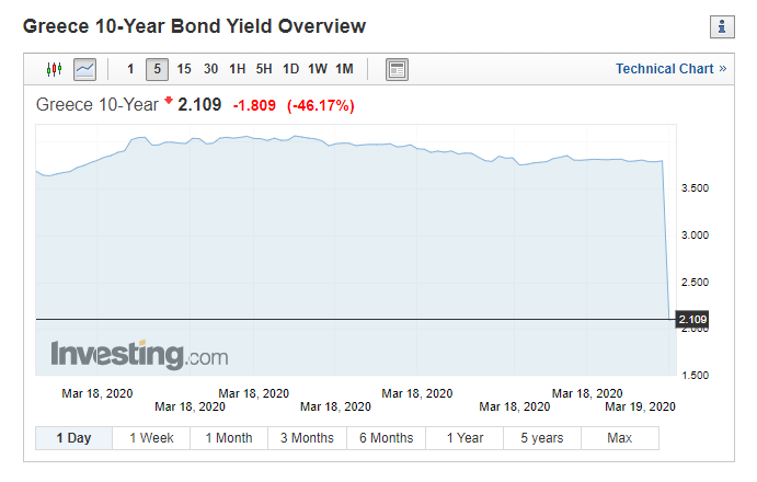 Σύμφωνα, μάλιστα, με τον Έλληνα υπουργό Οικονομικών, Χρήστο Σταϊκούρα η ΕΚΤ μπορεί να αγοράσει ελληνικά ομόλογα αξίας έως 12 δισ. ευρώ, με την πορεία της απόδοσης του 10ετους να αποδεικνύει ότι ανάλογο μήνυμα έχουν λάβει και οι αγορές.