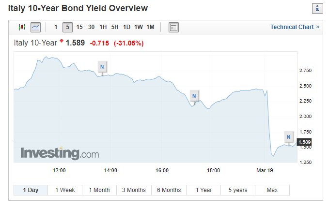Ανάλογη η εικόνα και για το 10ετές ιταλικό ομόλογο , με την απόδοση να υποχωρεί κατά 71 μονάδες βάσης, στο 1,5% που αποτελεί και χαμηλό εβδομάδας. Πάνω από 100 μ.β. η αποκλιμάκωση του 2ετούς τίτλου, στο 0,44%.