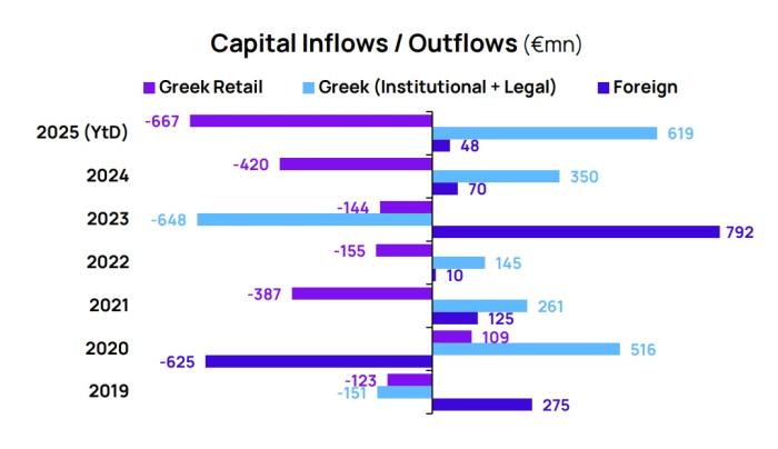 Στο σύνολο της χρονιάς οι Έλληνες θεσμικοί έχουν καθαρές εισροές 619 εκατ. ευρώ και οι Έλληνες επενδυτές 667 εκατ. ευρώ εκροές.