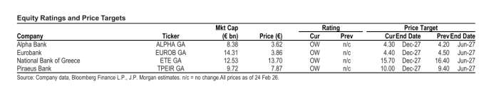 Σε τροχιά ισχυρών επιδόσεων παραμένουν οι ελληνικές τράπεζες, σύμφωνα με την τελευταία έκθεση της JP Morgan, η οποία ενόψει της ανακοίνωσης αποτελεσμάτων δ’ τριμήνου 2025 διατηρεί σύσταση υπεραπόδοσης (Overweight) και για τις τέσσερις συστημικές.