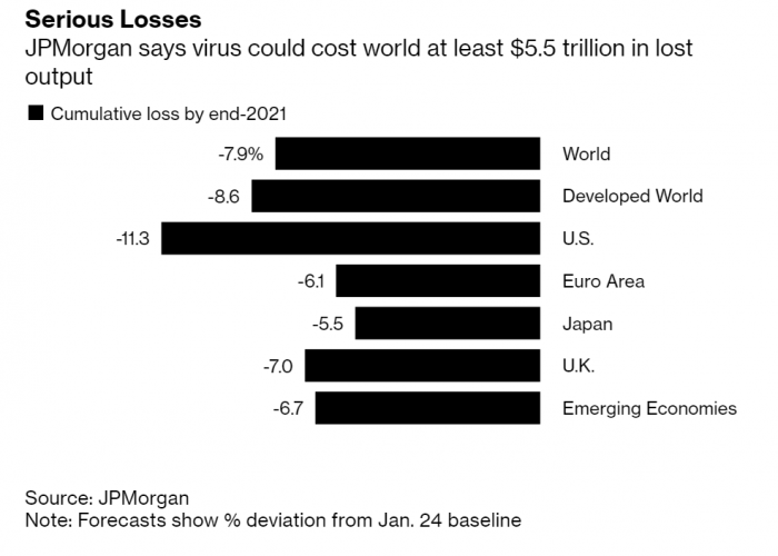 Μάλιστα οι αναλυτές της JPMorgan εκτιμούν ότι η απώλεια θα φθάσει στο ποσό των 5,5 τρισ. δολαρίων ή 8% του παγκόσμιου ΑΕΠ, δηλαδή ουσιαστικά η παγκόσμια οικονομία θα χάσει μία… Ιαπωνία, μία πρόβλεψη η οποία εάν επιβεβαιωθεί θα αποτελέσει τη χειρότερη πορεία του διεθνούς ΑΕΠ από τη δεκαετία του 1930 έως και σήμερα.