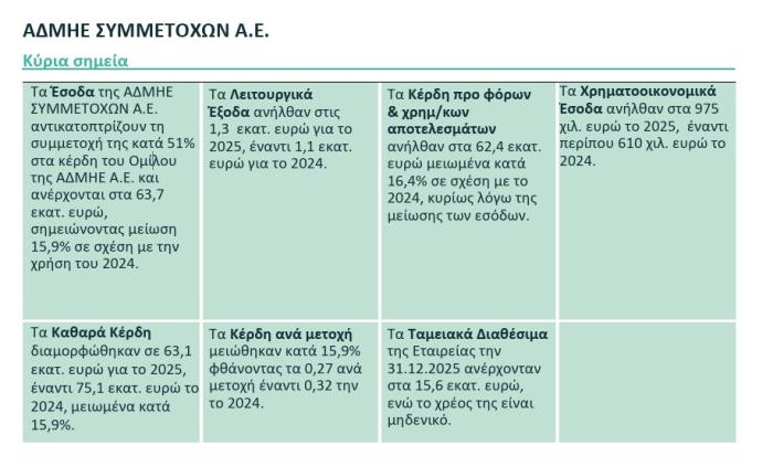 Σύμφωνα με τα αποτελέσματα του 2025, τα καθαρά κέρδη διαμορφώθηκαν στα 63,1 εκατ. ευρώ, μειωμένα κατά -15,9% σε σχέση με το 2024, ενώ αντίστοιχη ήταν και η πτώση των εσόδων, τα οποία ανήλθαν στα 63,7 εκατ. ευρώ.