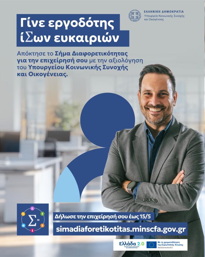 Οι επιχειρήσεις μπορούν να υποβάλουν την αίτησή τους μέσω της επίσημης ψηφιακής πλατφόρμας simadiaforetikotitas.minscfa.gov.gr έως τις 15 Μαΐου ή μέχρι τη συμπλήρωση 100 οριστικών αιτήσεων. Η διαδικασία είναι πλήρως ψηφιακή, εθελοντική και χωρίς οικονομική επιβάρυνση, ώστε κάθε επιχείρηση να έχει τη δυνατότητα να συμμετάσχει ισότιμα σε αυτή την πρωτοβουλία.