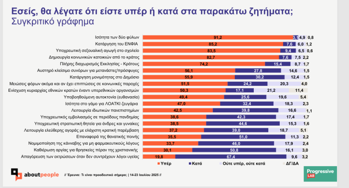 Στα ίδια ζητήματα, στο δίλημμα «υπέρ» ή «κατά», η πλειοψηφία τάσσεται υπέρ της ισότητας των δύο φύλων (91,2%), της κατάργησης ΕΝΦΙΑ (85,2%), της υποχρεωτικής σεξουαλικής αγωγής στο σχολείο (83,5%) και της δημιουργίας κοινωνικών κατοικιών (82,7%). Χαμηλότερα εμφανίζονται η επαναφορά της θανατικής ποινής (35,5%), η νομιμοποίηση της κάνναβης για μη φαρμακευτικούς λόγους (33,7%), η καθιέρωση αργιών για θρησκείες πέραν της χριστιανικής (30,1%) και η απαγόρευση των αμβλώσεων όταν δεν συντρέχουν λόγοι υγείας (19,8%).