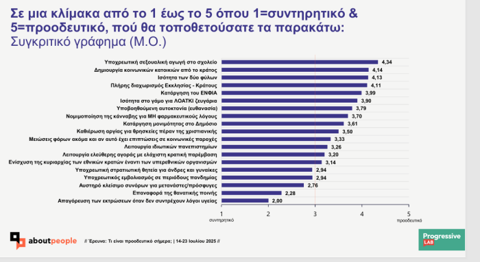 Αντίθετα, η επαναφορά της θανατικής ποινής (2,28) και η απαγόρευση των εκτρώσεων χωρίς ιατρικό λόγο (2,00) αξιολογήθηκαν ως πιο συντηρητικές θέσεις.