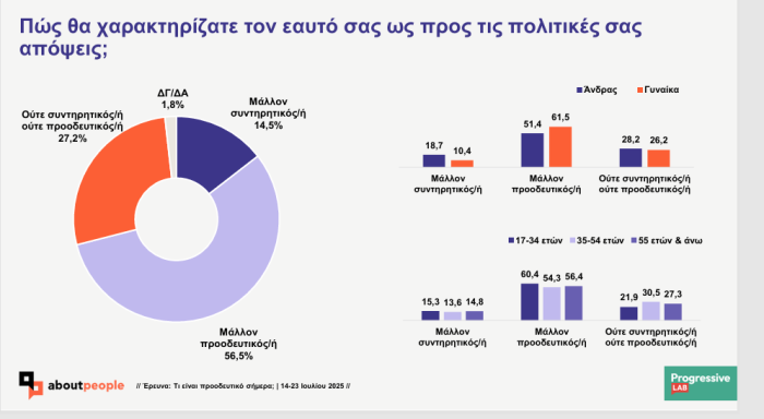 Η μελέτη, που πραγματοποιήθηκε από την aboutpeople σε δείγμα 2.260 ατόμων, δείχνει ότι περισσότεροι από τους μισούς πολίτες αυτοπροσδιορίζονται ως «μάλλον προοδευτικοί», με θετική στάση απέναντι στον όρο «προοδευτικό» και αρνητική απέναντι στον χαρακτηρισμό «συντηρητικός».