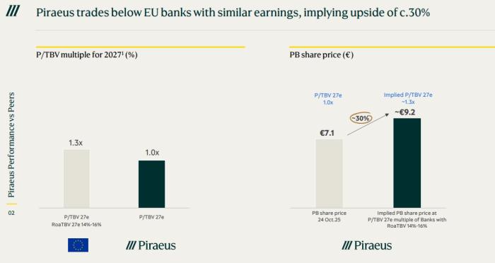 Τράπεζα Πειραιώς: Περιθώριο ανόδου 30% εντοπίζει η διοίκηση της Τράπεζας Πειραιώς για τη μετοχή με βάση τις αποτιμήσεις των ευρωπαϊκών τραπεζών. Όπως ανέφερε στην ενημέρωση των αναλυτών οι ευρωπαϊκές τράπεζες διαπραγματεύονται με δείκτη P/TBV 1,3 φορές με βάση την εκτίμηση για το 2027 και η απόδοση των κεφαλαίων είναι 14-16%.