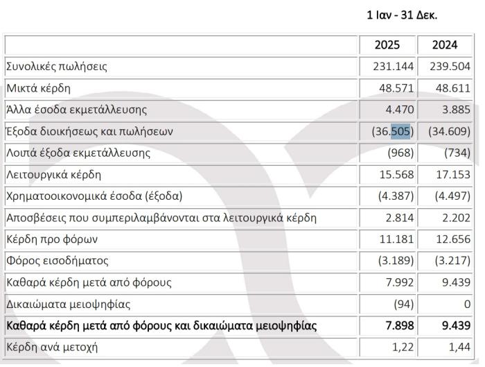Έτσι τα καθαρά κέρδη μειώθηκαν στα 7,9 εκατ. ευρώ από 9,4 εκατ. ευρώ.