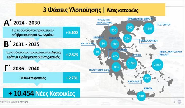 Το πρόγραμμα για τις νέες κατοικίες θα έχει τρεις φάσεις υλοποίησης Απο το 2024 - 2030 θα κατασκευαστούν 5.100 νέες κατοικίες για το σύνολο του προσωπικού σε Έβρο και νησιά του Αν. Αιγαίου.