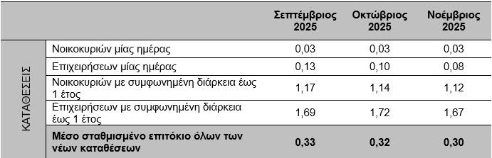 Σύμφωνα με τα τελευταία διαθέσιμα στοιχεία από την Τράπεζα της Ελλάδος, στην Ελλάδα τον Νοέμβριο του 2025 το μέσο σταθμισμένο επιτόκιο παρέμεινε σχεδόν αμετάβλητο στο 0,30% για όλες τις νέες καταθέσεις και στο 0,31% για τις υφιστάμενες.