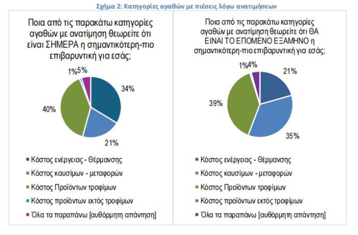 Όπως φαίνεται στο σχήμα 2, ως προς τις κατηγορίες προϊόντων με τη μεγαλύτερη επιβάρυνση, οι καταναλωτές εκτιμούν ότι η μεγαλύτερη επιβάρυνση σήμερα είναι από τις τιμές καυσίμων-ενέργειας (αθροιστικά) και τις τιμές τροφίμων.