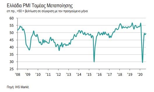 Σύμφωνα με τα στοιχεία της IHS Markit για τον ελληνικό μεταποιητικό τομέα τον Αύγουστο, η βραδύτερη συνολική υποχώρηση ήταν σε μεγάλο βαθμό αποτέλεσμα της ήπιας συρρίκνωσης της παραγωγής και των νέων παραγγελιών, καθώς και της επιστροφής της απασχόλησης σε ρυθμούς ανάπτυξης, λόγω της αυξημένης επιχειρηματικής εμπιστοσύνης. Ωστόσο, οι νέες εργασίες υποχώρησαν με σταθερό ρυθμό λόγω της ιστορικά εξασθενημένης ζήτησης από την πλευρά των πελατών, μετά το ξέσπασμα της πανδημίας του κορονοϊού 2019.